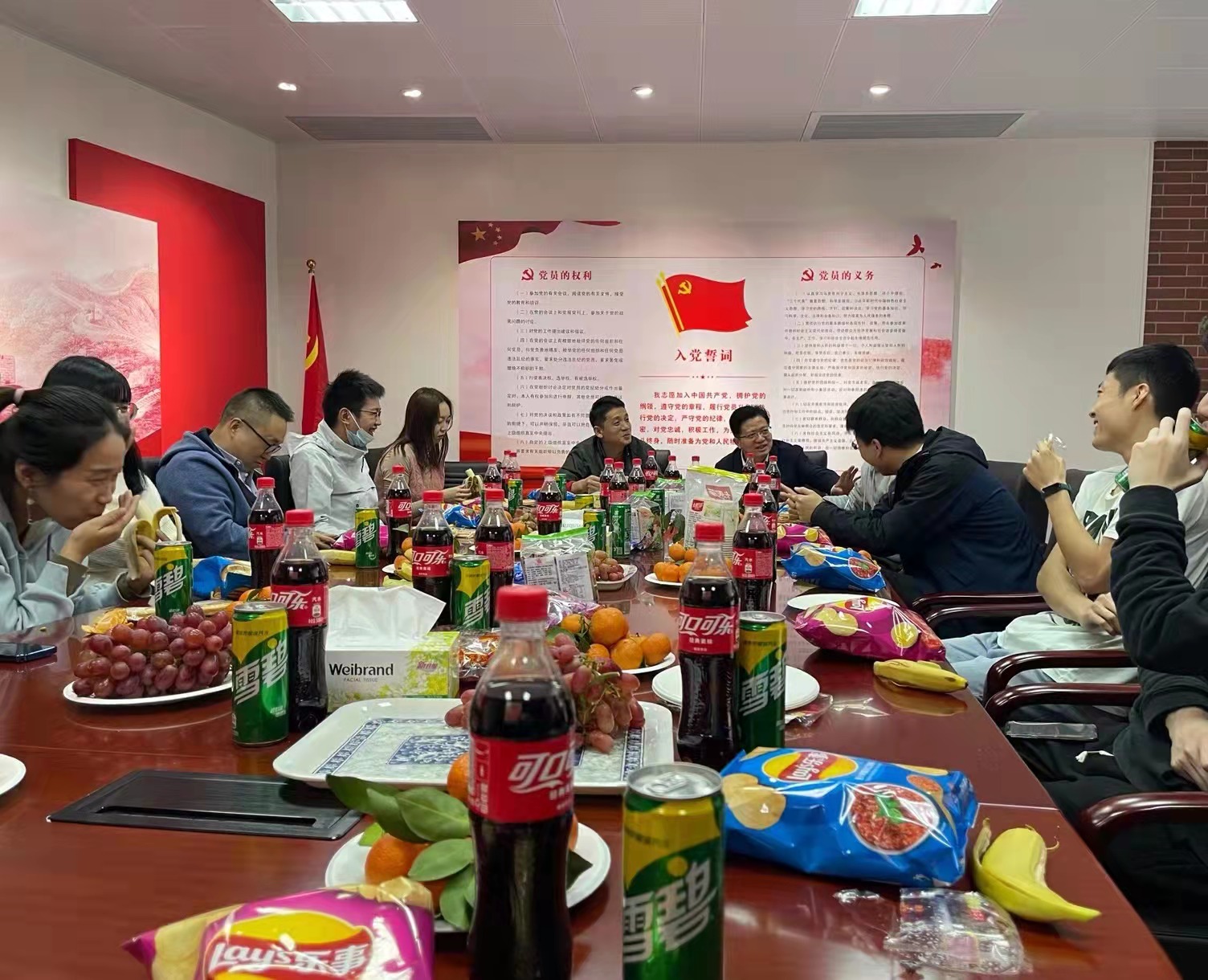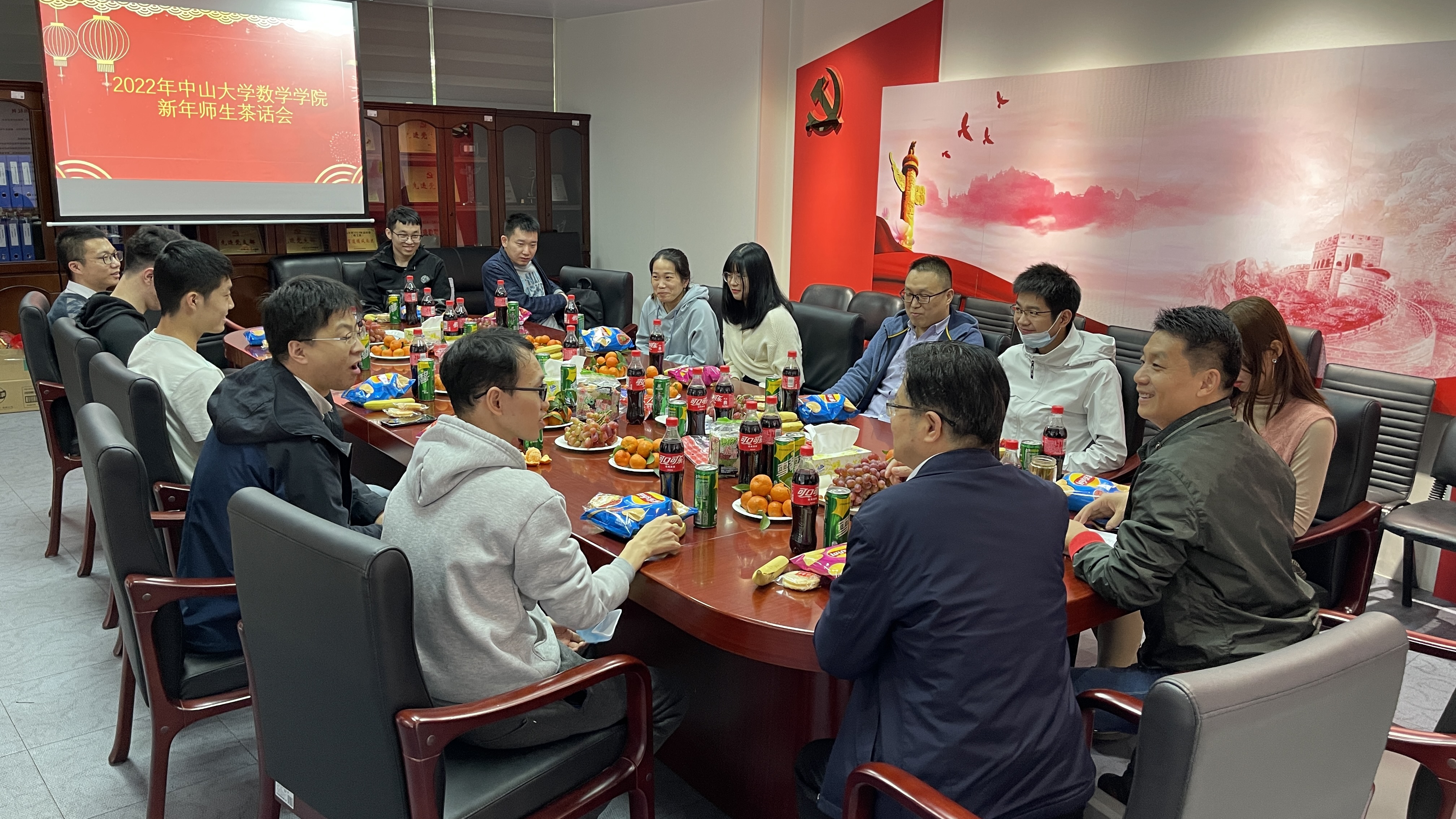 随后,学院师生共享美食,在其乐融融的氛围下共同分享自己家乡的过年习俗与有趣的经历。汕头的同学向大家介绍过年的花市,北方的博士大师兄为大家分享烧柏火的有趣经历;佛山的潘文亮老师介绍了祖庙等过年习俗,陕西的同学则给大家描述了舞狮打鼓的热闹场景。来自五湖四海的师生积极分享着曾经的春节记忆和经历过的趣味故事,让彼此都感受到浓浓的异地年味。孙小强副教授说:“虽然国家幅员辽阔,过年的习俗也因地域各不相同,但大家过年的心情是一样的”。茶话会在热闹的聊天与新春祝福声中结束。