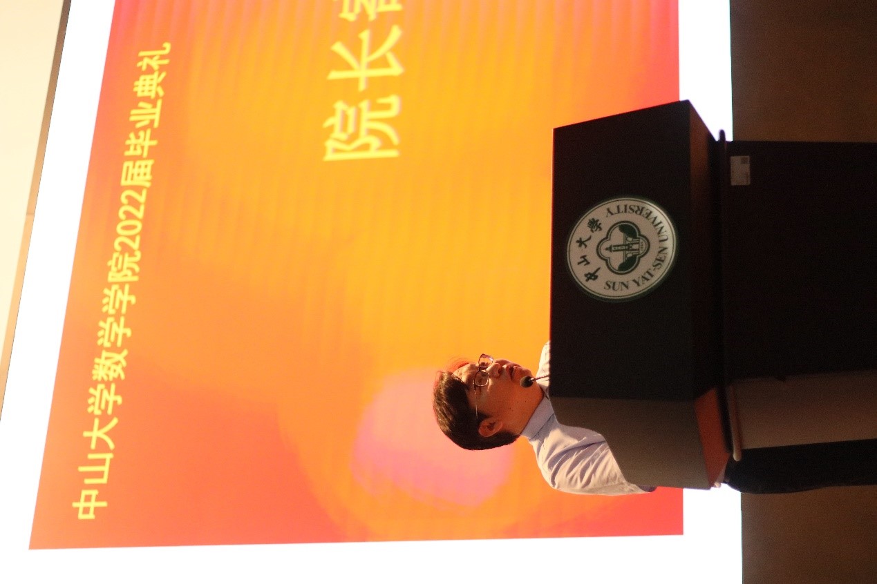 院长陈兵龙教授宣读授予学士、硕士及博士学位名单后,他对毕业生们发表了毕业寄语。他代表学院全体教职员工向顺利完成学业的2022届全体毕业生表示祝贺。临别之际,陈院长也给同学们提出了殷切嘱托,一是秉承中大校训“博学、审问、慎思、明辨、笃行”,不畏艰险,勇挑重担。二是志存高远,做一名担当使命、坚守初心、踏实研究的数学人, “相信经过数学的磨砺,你们会比同龄人多一份底气与自信,多一份从容与淡定,也必定会多一份顽强与坚定”。三是关心政治,关心时事,做一个有价值的青年人,筑牢数学人的基础,不忘数学人的根本,把青春资本转化为奋斗资源,把有限的青春转化为无限的可能。