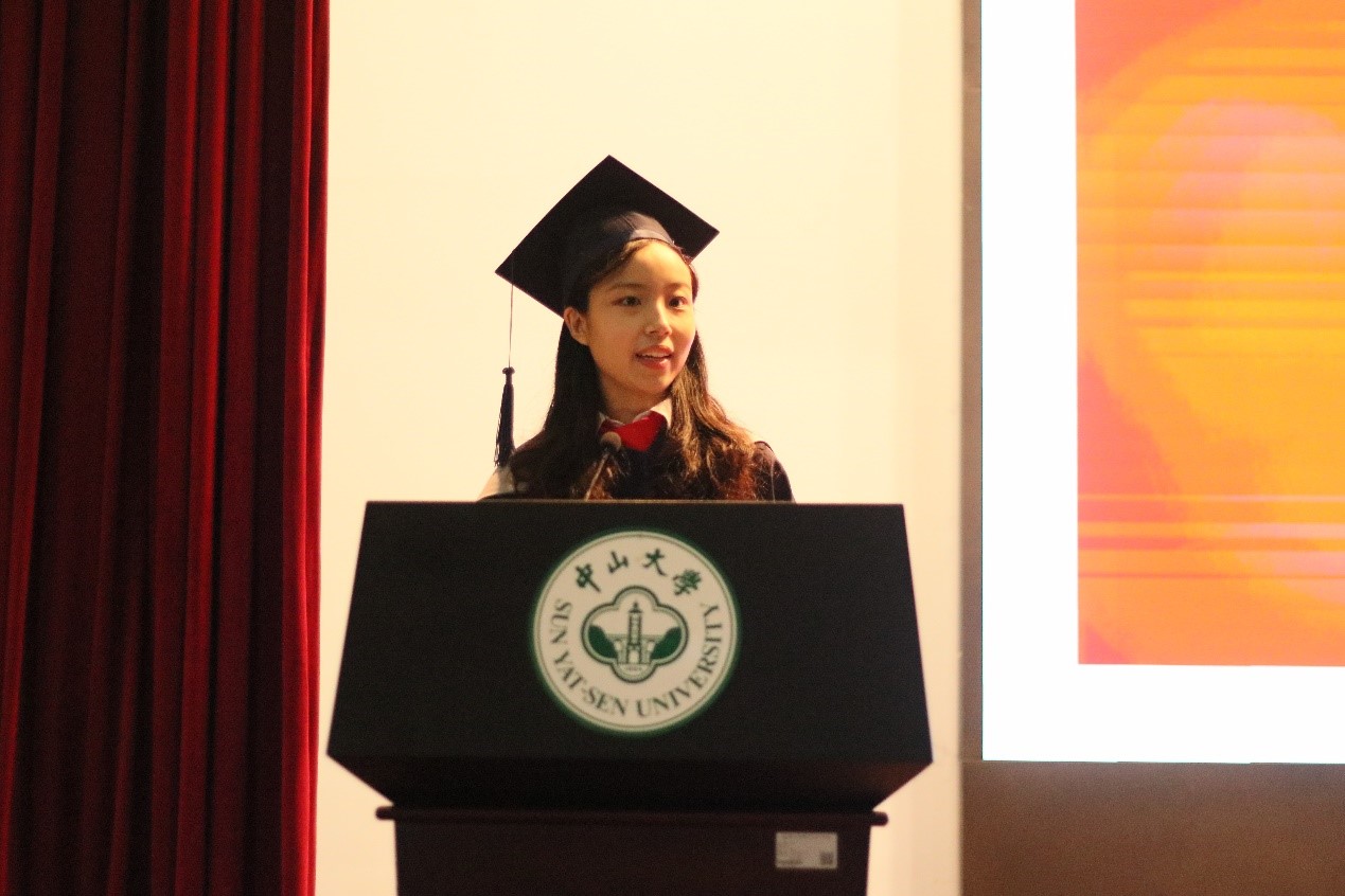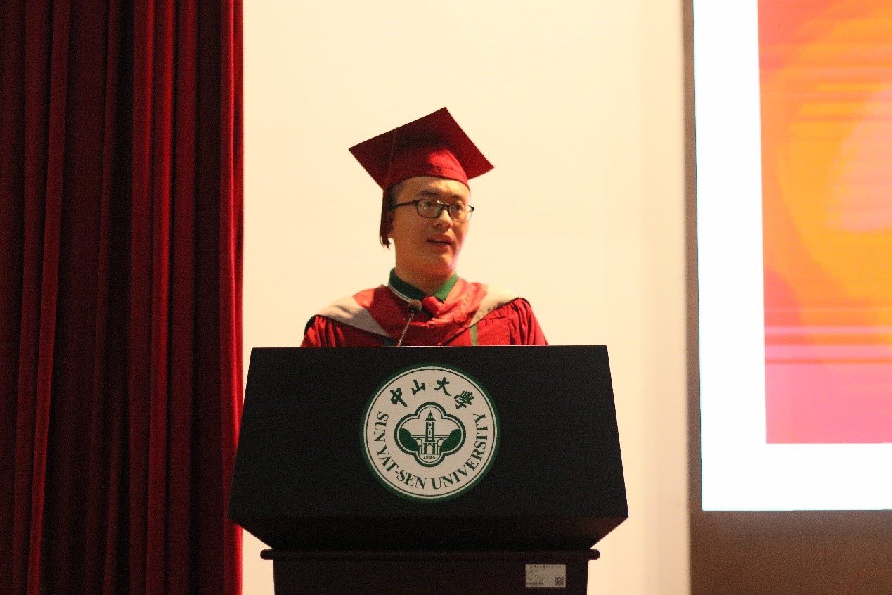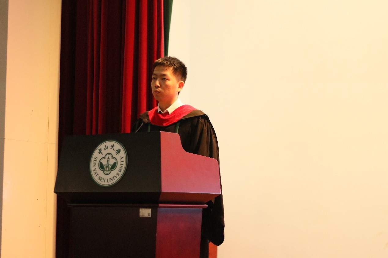作为博士毕业生代表的杨鹏同学分享了在中大孜孜不倦,奋斗不息的求学历程,向培养自己的母校、教诲自己的师长表达了真诚的感谢,秉承校训,求知求实,怀报国之志与感恩之心扬帆起航。“当我再开口时已经在唱别人的校歌了”,作为硕士研究生代表的王艺蒙同学表达了对即将离开母校的深切不舍,“我特别想再唱唱自己的校歌”。一句“中大,在我们身后了”,古树参天的校园里,不厌其烦指导学生的导师,秉持着“学生无小事,事事皆关心”的学院领导和辅导员老师,都即将成为珍贵回忆里的人物;一句“中大,就在我们身后”,未来征程,或坦途或曲折,中大精神始终激励着我们踏棘而歌,手指星辰!