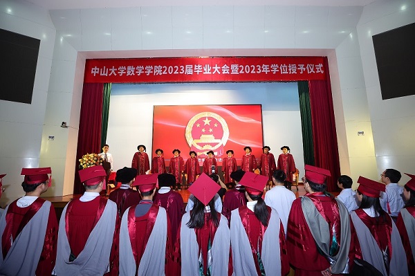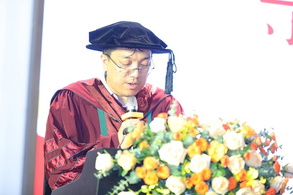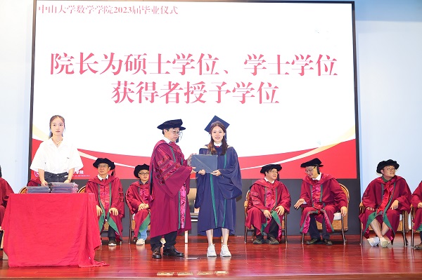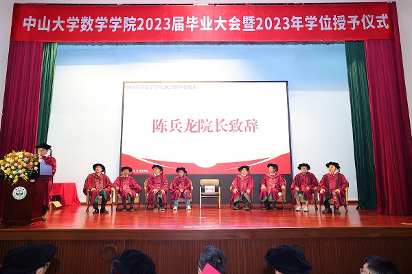 典礼伊始,陈兵龙院长致辞,他首先对所有即将开启人生新征途的毕业生们表示了热烈的祝贺,接着从数学的角度出发,勉励诸君当志存高远、坚守初心。在未来的道路上,不骄傲狂妄,也不妄自菲薄。经过数学的磨砺,收获比同龄人多一份的底气与自信,多一份的从容与淡定、顽强与坚定。而这些增益又将助力数院学子行稳致远,取得属于各自的美好前程。最后陈兵龙院长亲切地对从今天开始中大数院最年轻的校友说:“数院的怀抱永远为你们敞开!”致辞结束,台下响起热烈的掌声。