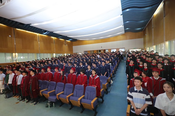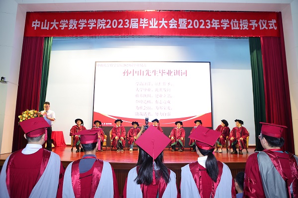 接着,阮映东书记宣读孙中山先生毕业训词,全体毕业生起立聆听:“学海汪洋,毓仁作圣,大学毕业,此其发轫。植基既固,建业立名,登峰造极,有志竟成。为社会福,为邦家光,勖哉诸君,努力自强。”先生之教诲,历久弥新,勉励着一届又一届中大学子奋发向前。