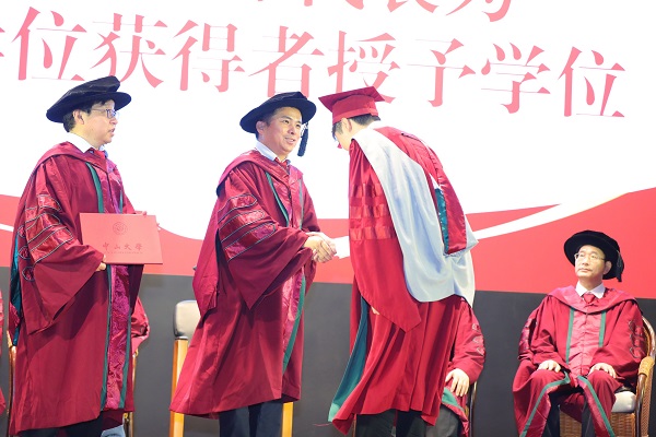 接下来博士学位获得者上台,由陈兵龙院长以及导师代表为他们授予博士学位。紧接着,院长带领全体硕士学位、学士学位获得者集体拨穗,并为他们授予学位。