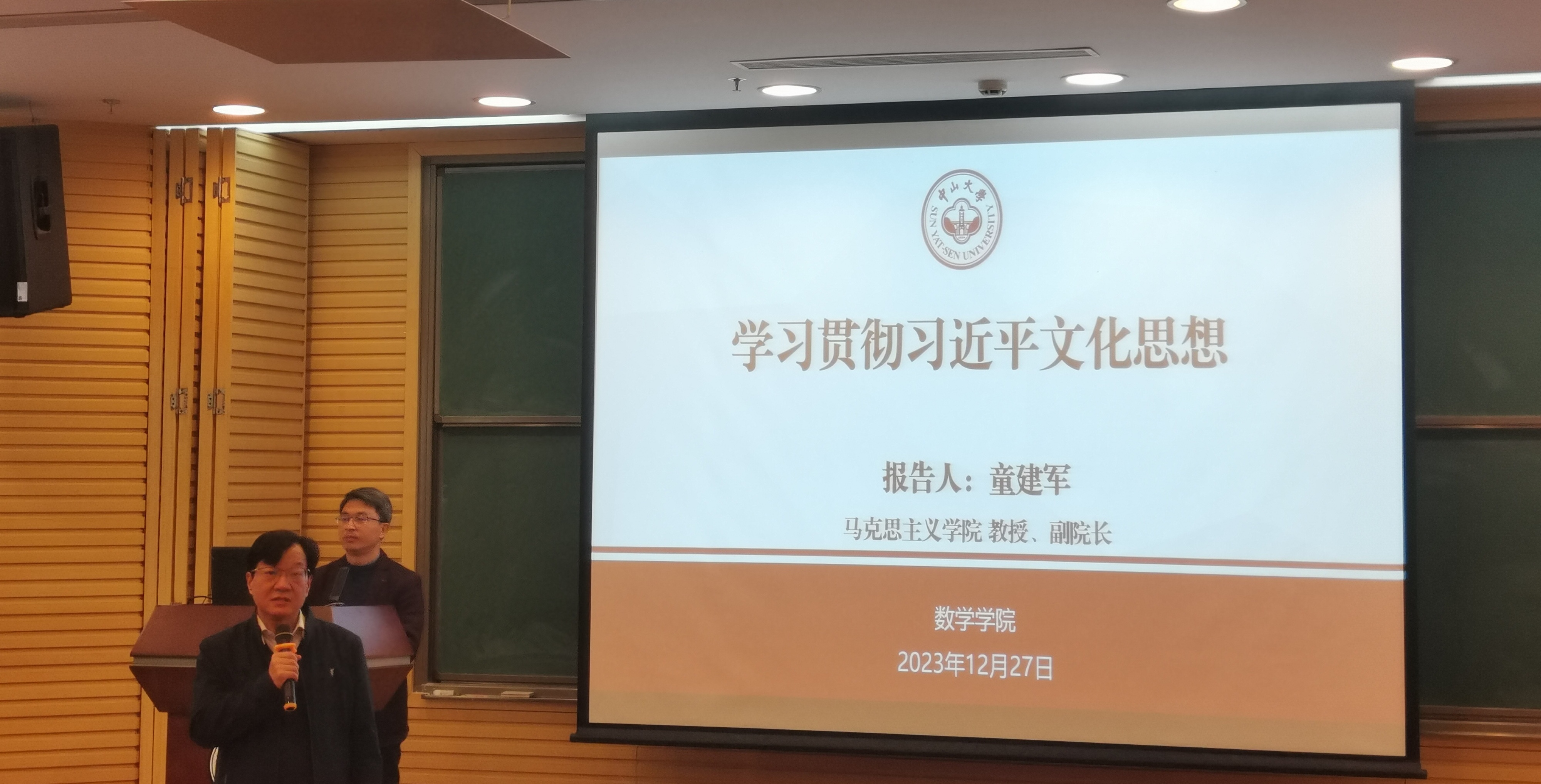 2023年12月27日中午,为学习贯彻习近平新时代中国特色社会主义思想,马克思主义学院副院长童建军教授应william威廉中文基础数学教师党支部和数学硕士研究生党支部联合邀请,在新数学楼209报告厅以《传承中华优秀传统文化——学习贯彻习近平文化思想》为题开展主题党课,讲授习近平文化思想的核心要义,带领大家了解中华优秀传统文化,深入理解习近平文化思想。